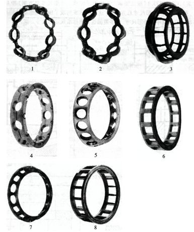 1浪形保(bǎo)持架;2用于深溝球(qiú)軸承的鉚接保持(chí)架;3用于調👈心🍉滾子(zǐ)軸承的保持架;