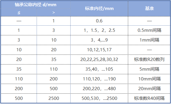 公制(zhi)軸承的内徑(d),在0.6~2500mm範(fàn)圍内規定了90種标(biāo)準尺寸,如下表:
